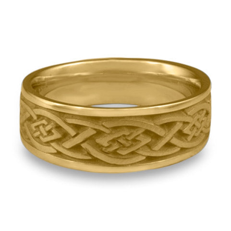 This Wide Celtic Diamond Wedding Ring in 14K Yellow Gold by Katherine Aberle is made with eco-friendly methods using recycled 14K Yellow Gold. It is sent to you via free Fedex ground shipping. This ring is available in sizes ranging from size 5 through size 12. Other sizes may also be available. Please inquire by telephone for pricing on these.