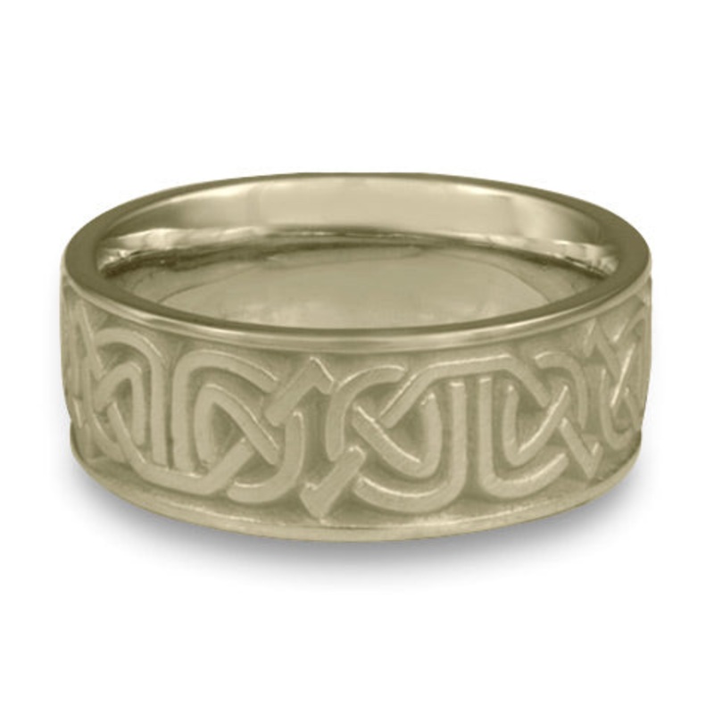 This Wide Labyrinth Wedding Ring in 18K White Gold by Katherine Aberle is made with eco-friendly methods using recycled 18K White Gold. It is sent to you via free Fedex ground shipping. This ring is available in sizes ranging from size 5 through size 12. O