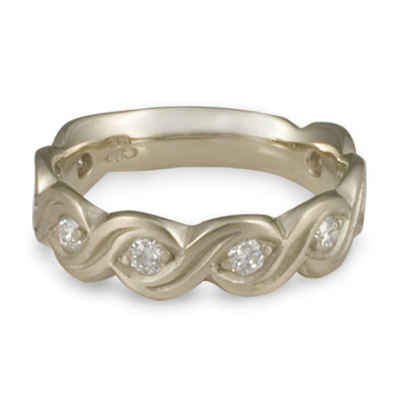 This Wide Tides with Diamonds Wedding Ring in 14K White Gold by Katherine Aberle is made with eco-friendly methods using recycled 14K White Gold. It is sent to you via free Fedex ground shipping. This ring is available in sizes ranging from size 5 through size 12. Other sizes may also be available. Please inquire by telephone for pricing on these.