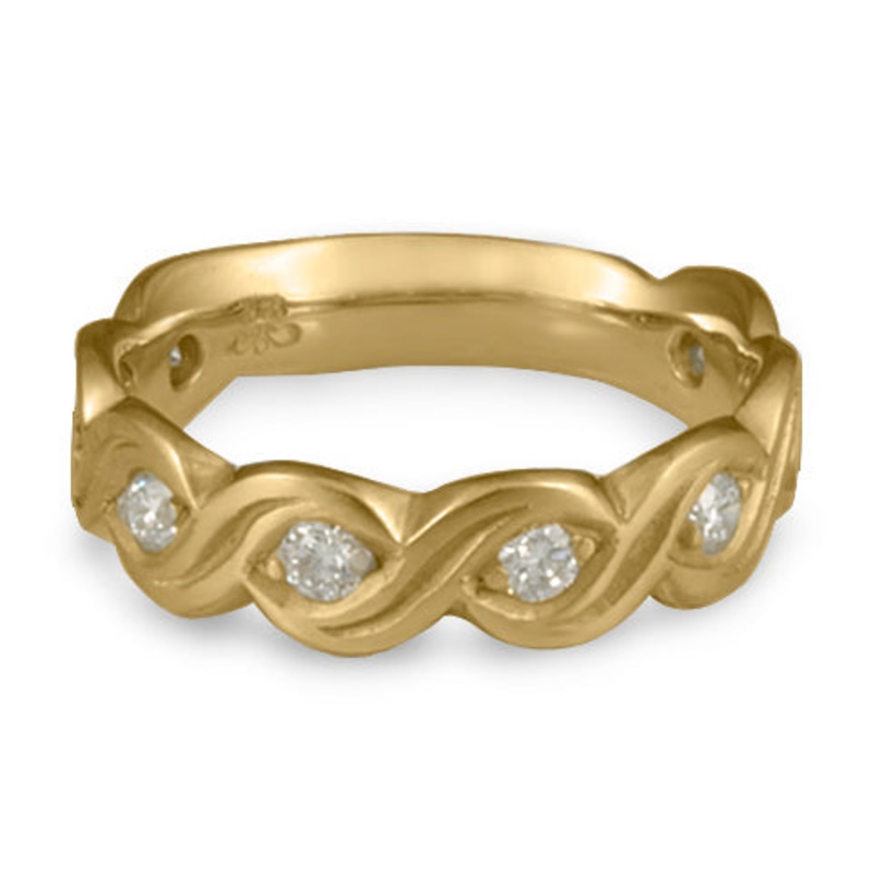This Wide Tides with Diamonds Wedding Ring in 14K Yellow Gold by Katherine Aberle is made with eco-friendly methods using recycled 14K Yellow Gold. It is sent to you via free Fedex ground shipping. This ring is available in sizes ranging from size 5 through size 12. Other sizes may also be available. Please inquire by telephone for pricing on these.