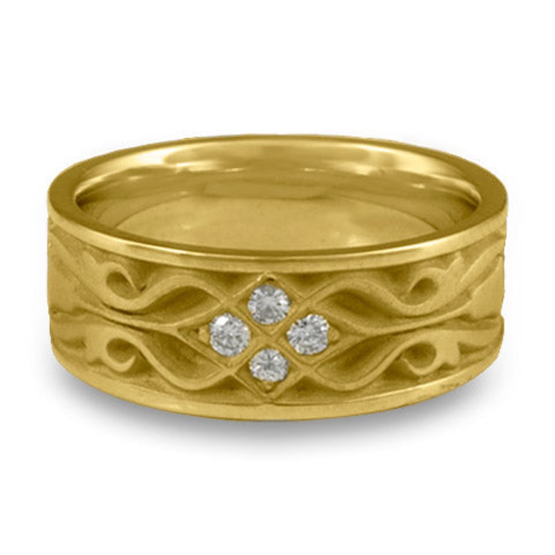 Symbolic Meaning: The central motif in this ring is a diamond shape accented with four small diamonds. The diamond design, with its pointed top and sides, represents connection to both Spirit and the Earth. With this ring, the horizontal points of the diamond extend to create the image of a flower. In sum, this ring symbolizes walking on Earth while connecting to both Beauty and Spirit.