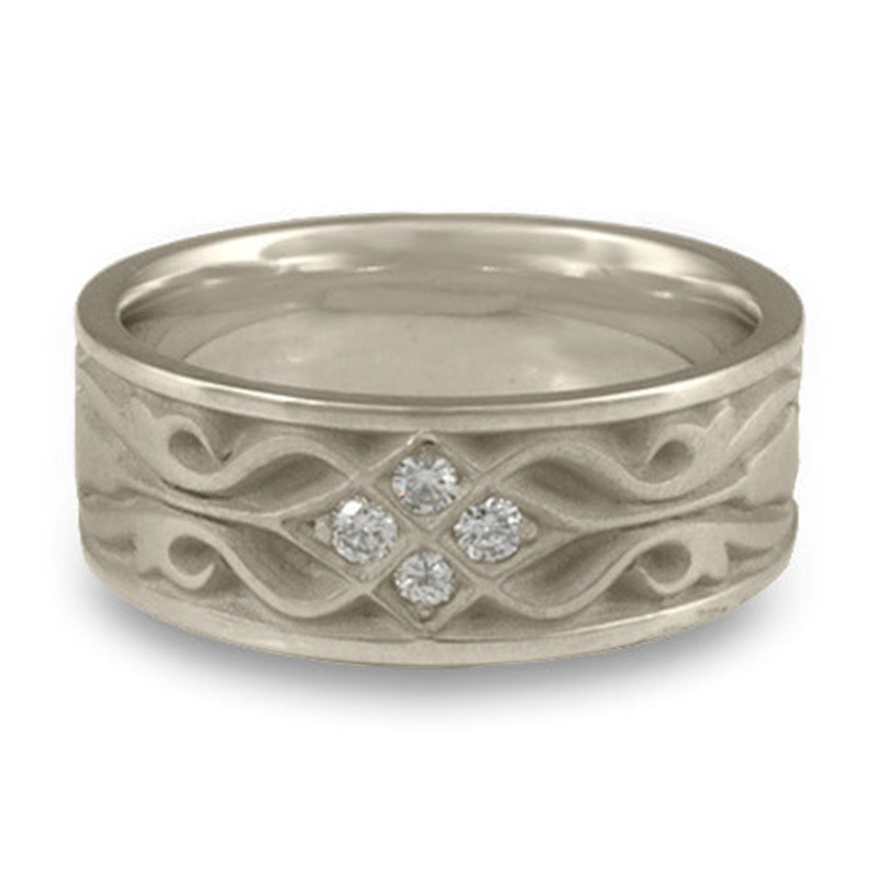 Symbolic Meaning: The central motif in this ring is a diamond shape accented with four small diamonds. The diamond design, with its pointed top and sides, represents connection to both Spirit and the Earth. With this ring, the horizontal points of the diamond extend to create the image of a flower. In sum, this ring symbolizes walking on Earth while connecting to both Beauty and Spirit.