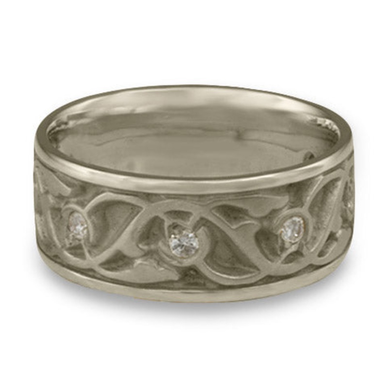 This Wide Tulips and Vines Wedding Ring With Diamonds in 14K White Gold by Katherine Aberle is made with eco-friendly methods using recycled 14K White Gold. It is sent to you via free Fedex ground shipping. This ring is available in sizes ranging from size 5 through size 12. Other sizes may also be available. Please inquire by telephone for pricing on these.
