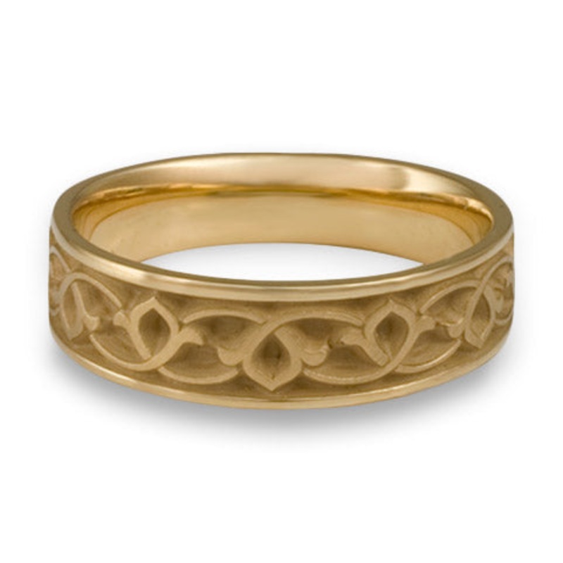 This Wide Water Lillies Wedding Ring in 14K Yellow Gold by Katherine Aberle is made with eco-friendly methods using recycled 14K Yellow Gold. It is sent to you via free Fedex ground shipping. This ring is available in sizes ranging from size 5 through size