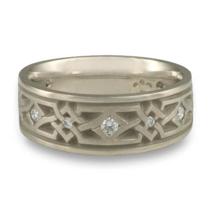 This Wide Weaving Stars with Diamonds Wedding Ring in 14K White Gold by Katherine Aberle is made with eco-friendly methods using recycled 14K White Gold. It is sent to you via free Fedex ground shipping. This ring is available in sizes ranging from size 5 through size 12. Other sizes may also be available. Please inquire by telephone for pricing on these.
