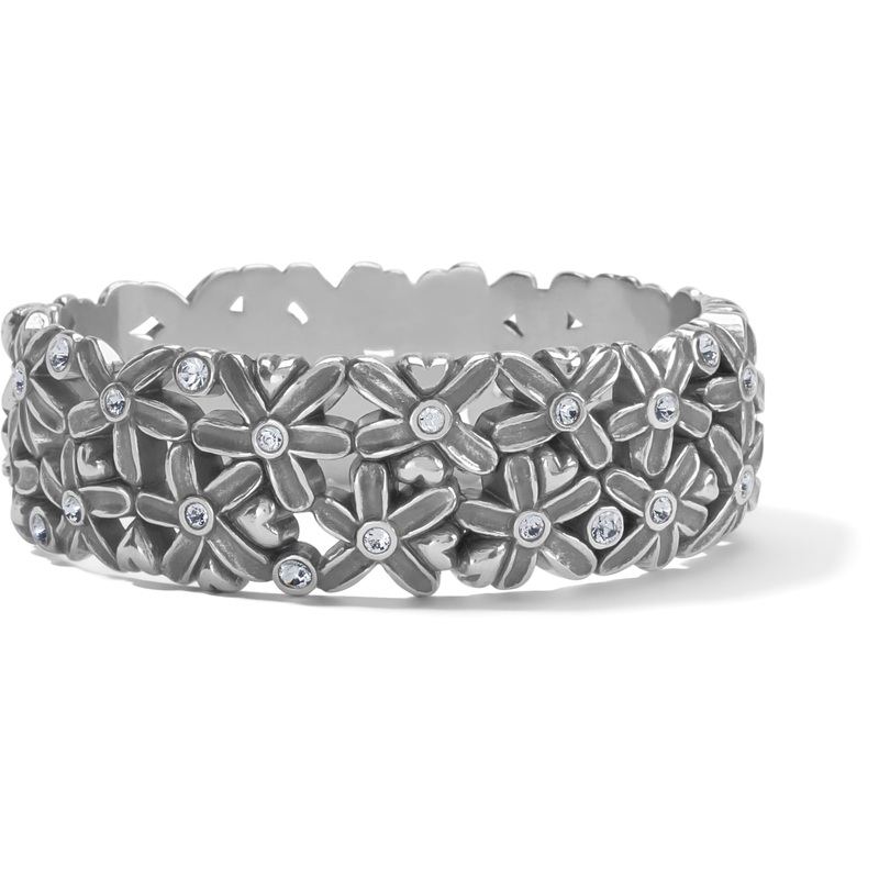 Encircle your wrist with a wreath of silvery flowers our designer created this intricate bouquet to Brighton your day.Style: #JF8291Color: SilverClosure: HingedWidth: 7/8"Diameter: 2 3/8"Material: Fine quality crystalFinish: Silver plated