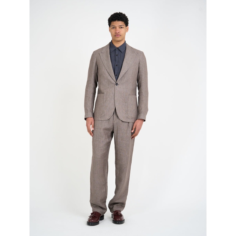 Perfect for summer weddings or smart events, our 100% linen Wilkins brown suit features our unstructured lightweight Laurel jacket, which references the southern Italian characteristic of broad peak lapels. The brown linen features a subtle pink chalk stripe. The jacket is completed by our straight-leg belted trousers with single pleats for a relaxed look that balances tailoring heritage with modern aesthetics.