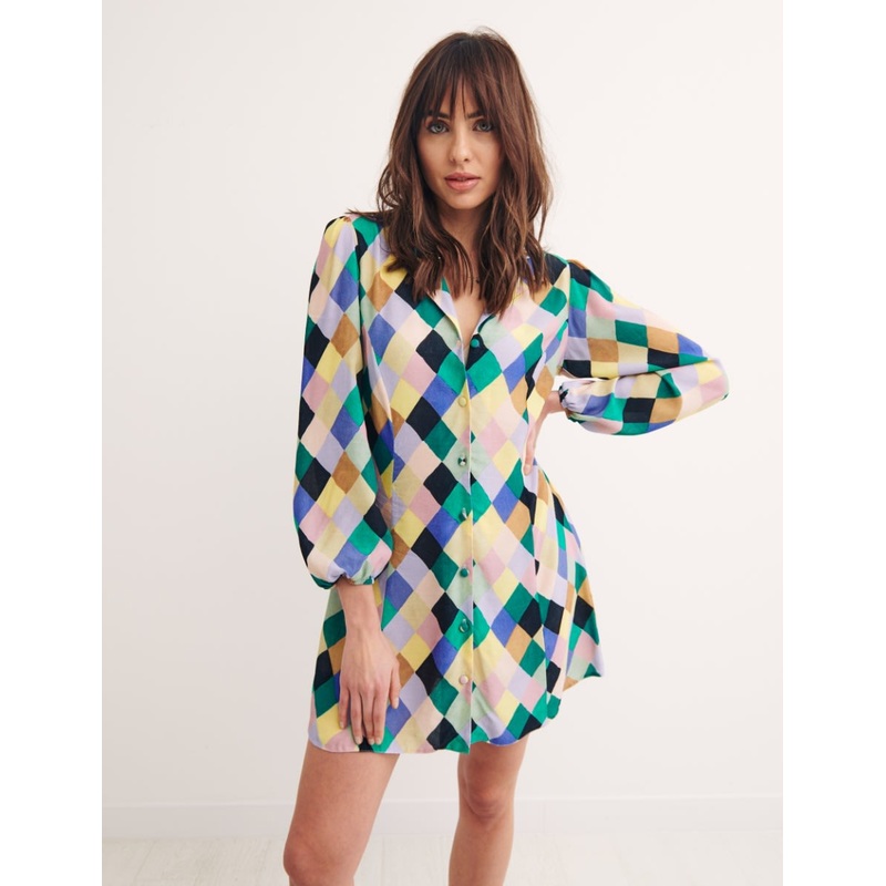 Our flattering V-neck Willa dress is back in an earthy green winter floral print. It's made using LENZING ECOVERO fibres and softly flares into a mini hem. Were wearing it with trainers and chunky boots.V-neck Relaxed long sleevesButton front