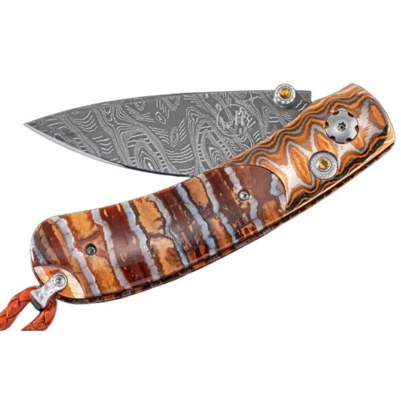 The Kestrel ‘Legend II’ features a beautiful and unique frame in ‘Wave Mokume’ that boasts a stunning inlay of 10,000 year-old fossil Woolly Mammoth tooth. The blade on this fine knife is hand-forged ‘Hornets Nest’ damascus by Mike Norris. The one-hand button lock and the thumb stud are been set with brilliant Citrine gemstones.The Kestrel is a compact, versatile folder; the design, which offers a deep finger groove at the intersection between the handle and blade, makes it remarkably comfortable in the hand while being very small and easy to carry. The Legend II features some of the exotic materials, and hand-forged metals that are the hallmark of William Henry’s collections; a timeless heirloom to be proudly worn and used for a lifetime before being handed-down to another generation.