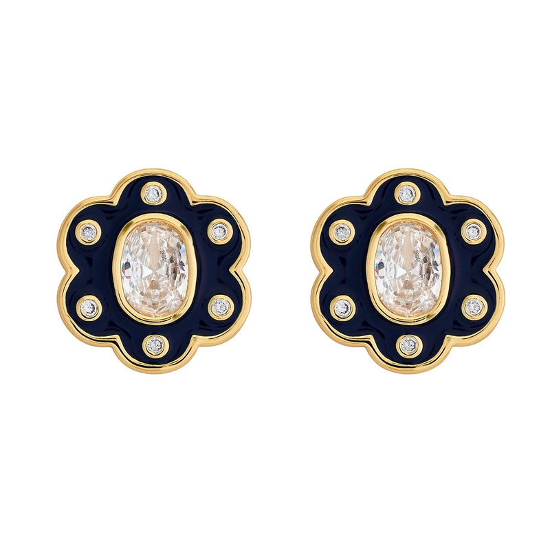 14k gold dipped Willow stud in navy enamel with an oval cz center