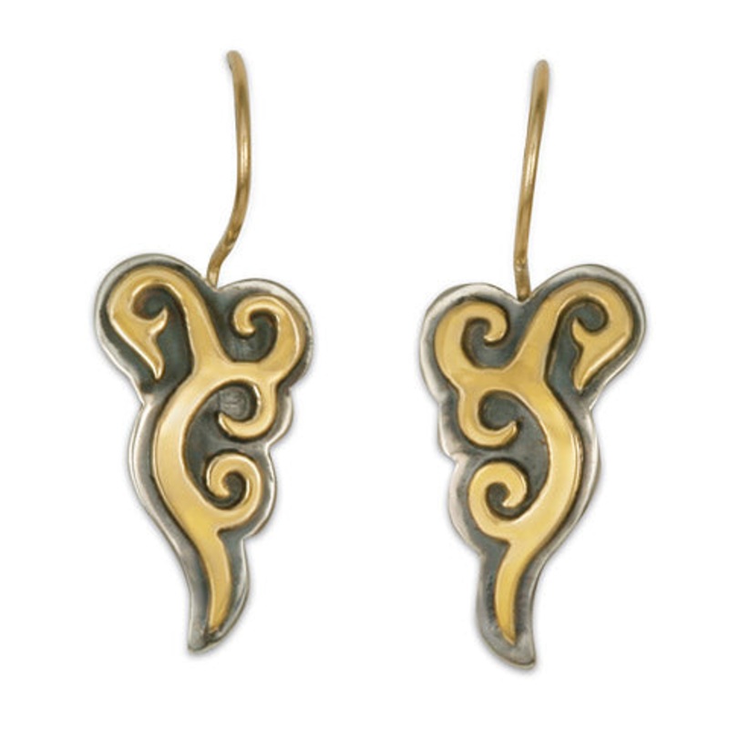 These Gold over Silver Earrings have a flowing Scroll Design that we call Wind Horse. Pictured with Gold earring wires.