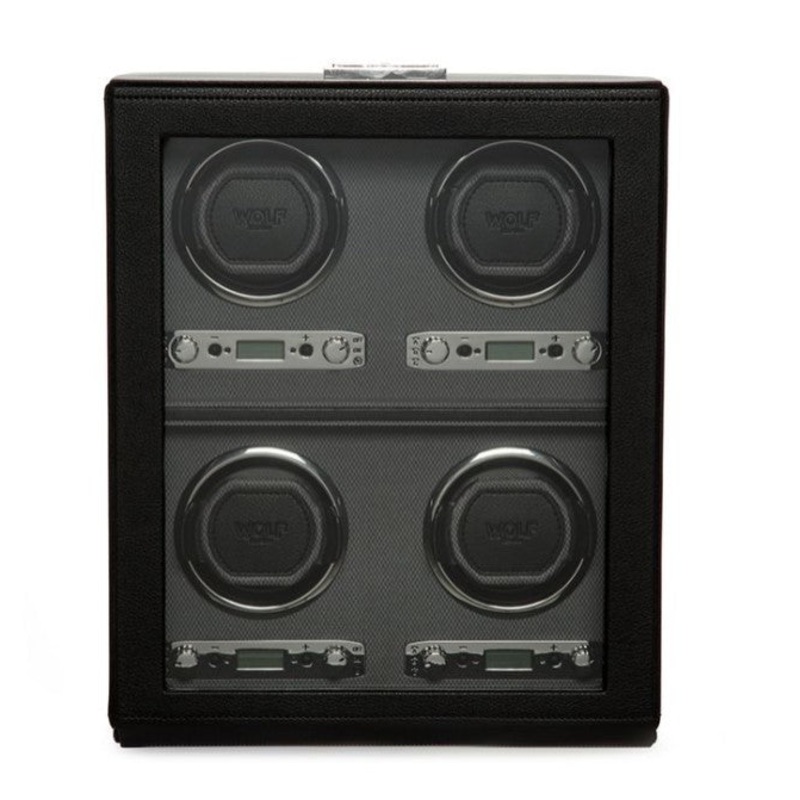 The 4-unit watch winder is covered in a lush pebble grained black faux leather with polished chrome hardware and lockable cover. The flip down frame has a tempered glass window that beautifully displays your timepiece while winding. The interior is lined in a luxurious textured silver silk fabric with large removable cuffs to accommodate watches up to 52mm in size. Powered by batteries with battery indicator on/off light or choose the optional AC power adapter included. Equipped with clockwise, counter-clockwise and bi-directional rotations with start/delay mode. Winding operation from 300-1200 TPD (turns per day) with back-lit LCD display.