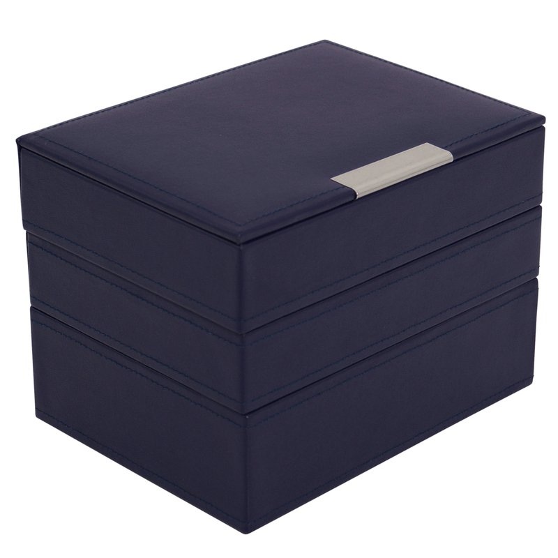 “Stackables, a colorful combination of jewelry and accessory storage trays with the unique ability to stack as high as you want, in any of the colors. Includes 3 trays (8 jewelry compartments, 4 ring rolls), purple faux leather and patterned fabric lining. 2 mini trays can also be stacked within 1 medium tray. Dimensions: 7’W X 5.25’D X 5.25’H Features: Material: Purple faux leather and patterned fabric lining