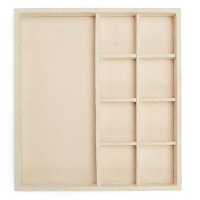 Organize and display jewelry with the Vault tray multi-compartment and earing half insert. Insert fits neatly into all stackable vault trays and features anti-tarnish LusterLoc lining. Beige color.