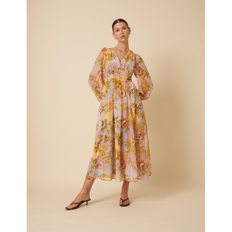 A floral masterpiece. Our midaxi dress combines a vintage-inspired floral print with a flattering empire waist and flowing silhouette. We love the V-neckline and button front detail. Style with barely-there heels for your next occasion. V-neckline Long bal