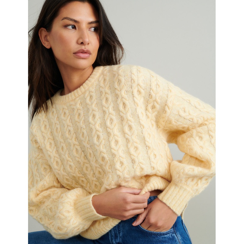 Make a cosy update to your current jumper collection. This butter yellow knit comes with a flattering crew neck. We love the cable knit design that continues down the long sleeves. Style with jeans and boots for a so-now look.