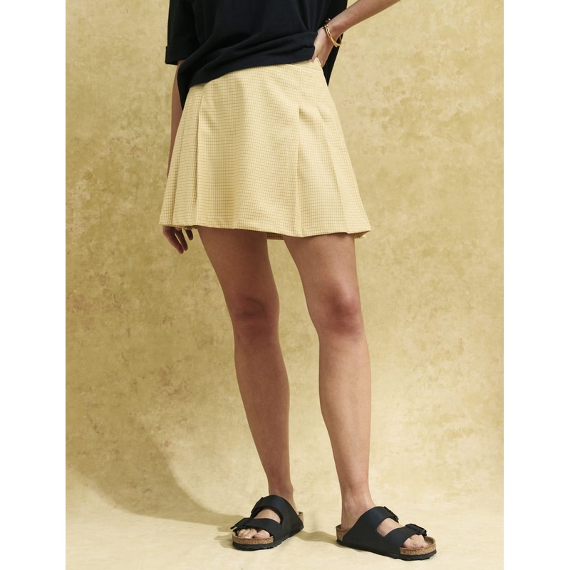 Pleated skirts are back. Kind of preppy, completely cool this mini is so of-the-moment in a yellow heritage check. Style yours with an oversized tee and chunky slides.Concealed zip fasteningA-line skirt that skims the body