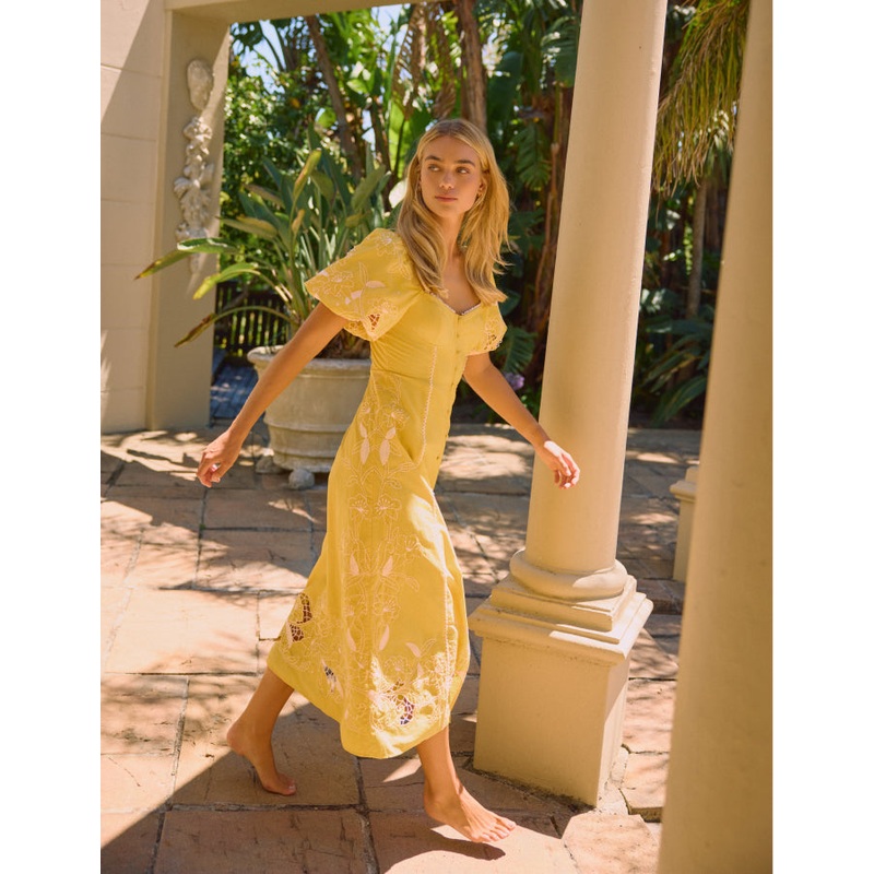 Pure sunshine. This golden-yellow midi is embroidered with delicate white broderie anglaise, framed by soft puff sleeves and a sweetheart neckline. Whether styled with heels or paired back with sandals and a sun hat, its made for brighter days.Sweetheart n