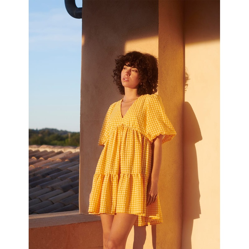 Making a statement in yellow gingham, our Vienna smock dress calls for days spent in the sun, whether its at home or on foreign shores. She then plunges to a low v-neck before flipping into a tiered skirt with tie detailing to the back. Slip into sandals a