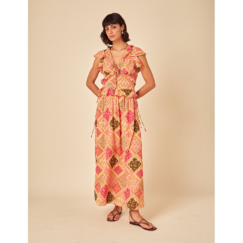 A little print goes a long way. Coming in a vintage-inspired patchwork print, our top features ruffle detail along the v-neck and sleeves. We love the button front detail too. Wear with everything you already own. V-neck Short sleeves Button front Size tip