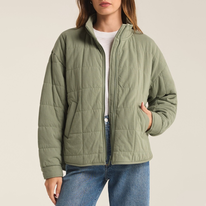 ZSupply Bonfire Jacket in Palm Green. Get cozy and stylish in our quilted jacket, boasting a flattering curved hem detail that adds warmth and flair to your look. Crafted from lightweight jersey fabric, with long sleeves, a collared neckline, zip front, and handy welt pockets, it’s the perfect addition to your casual wardrobe.