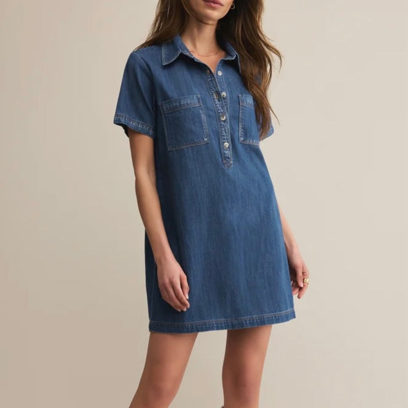 ZSupply Kellie Denim Mini Dress in Indigo. Meet your favorite shirt dress, in our new lightweight denim fabric. This mini has all the classic details: a collared neckline, short sleeves, patch pockets, and faux horn buttons making it easy, relaxed, and made to throw on and go.