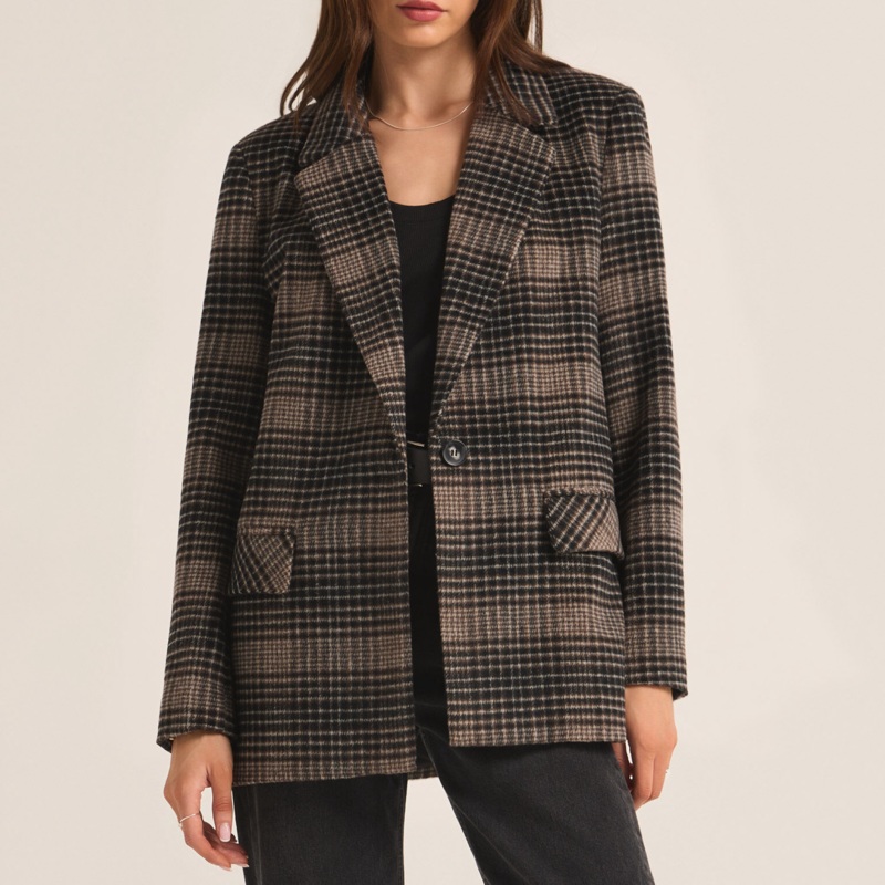 ZSupply Kingston Plaid Blazer in latte. Stay warm and stylish in this relaxed jacket crafted from a wool blend. With a notch collar, button-up design, flap pockets, and subtle shoulder pads, it's perfect for adding a touch of sophistication to your outfit.