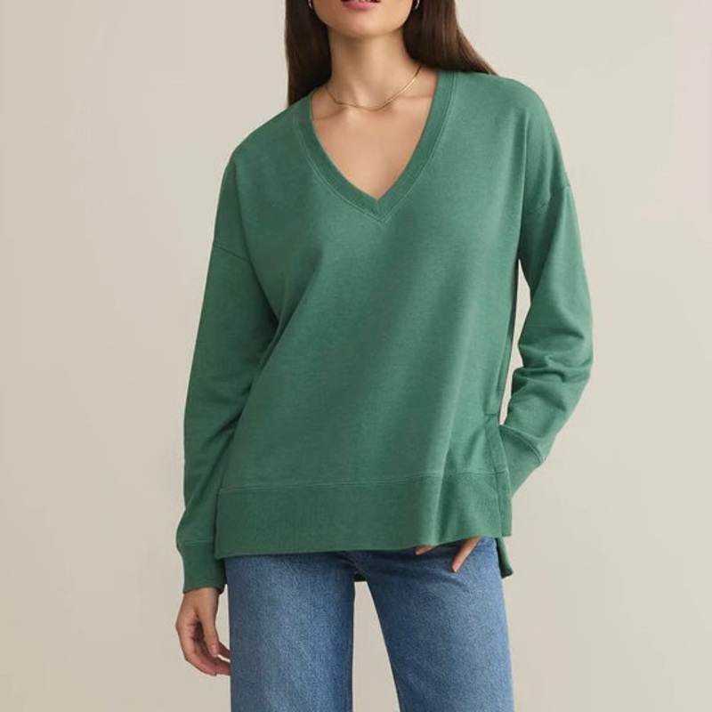 ZSupply Modern V Neck Weekender in Botanical Green.Part of our best-selling Essentials collection, this oversized silhouette is crafted from midweight french terry fabric, featuring our signature burnout treatment that gives a soft, lived-in feel that only