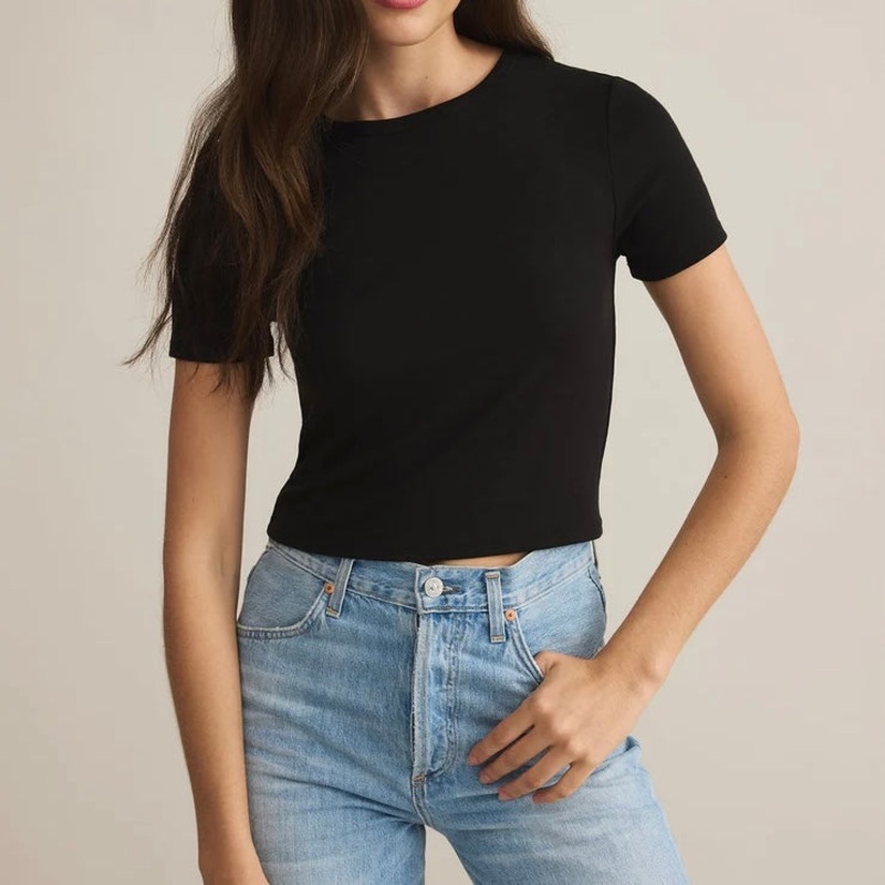 ZSupply Second Skin Crew in Black. This short-sleeve crewneck top is made with Second Skin Baby Rib fabric, giving it a soft, slightly stretchy feel. Designed to be tucked or worn loose, its a staple for layering or wearing alone depending on the occasion.