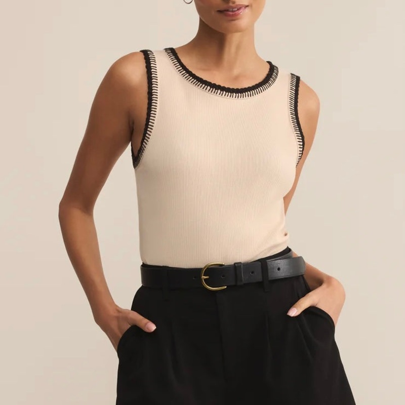 ZSupply Social Whipstitch Tank in crystal. Soft with a little something extra, this sleeveless tank features delicate whipstitch embroidery at the neckline and armholes. Crafted from our favorite Feather Rib fabric with a relaxed crew neck fit, its an effortless piece that feels anything but basic.