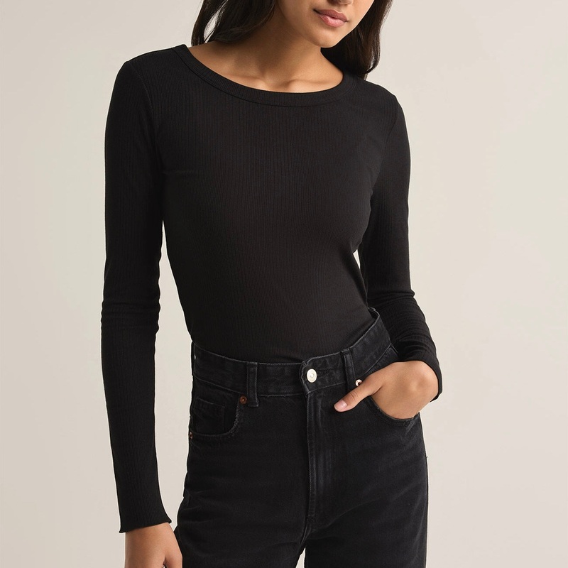 ZSupply Variegated Top in Black. Elevate your basics with this lightweight variegated rib top, designed with a flattering crew neck and delicate lettuce edge hem. The long sleeves and soft fabric make it an ideal layering piece for any season.Crew neckLong