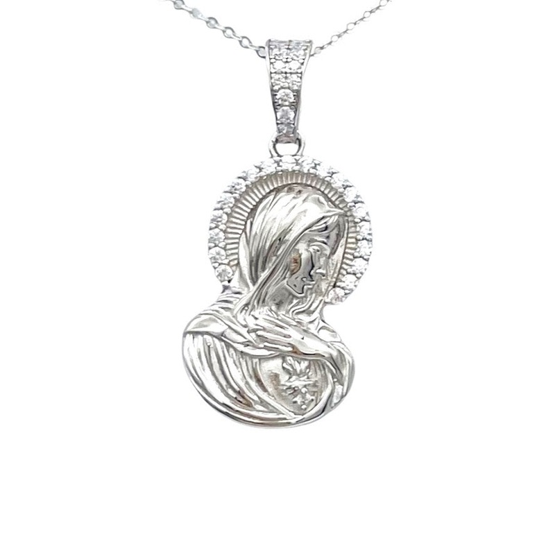 The Z1572P Mother Mary Pendant is expertly crafted from genuine 925 sterling silver and sparkling cubic zirconia. With its 35mm x 15mm size, it provides a stunning and delicate accent to any outfit. Elevate your style with this timeless and elegant piece.