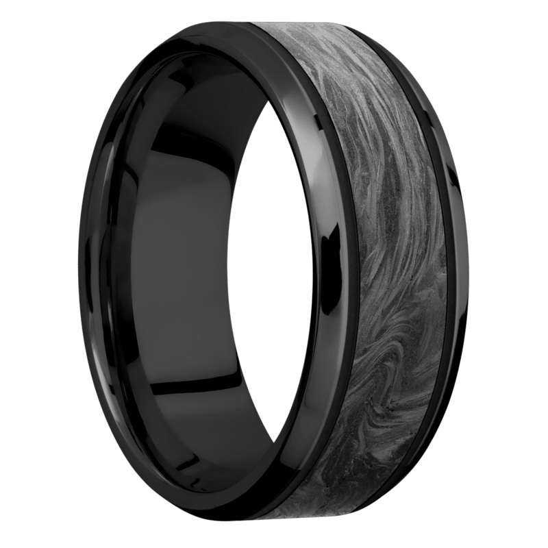 8 mm wide/Beveled/Zirconium band with one 5 mm Centered inlay of Forged Carbon Fiber.