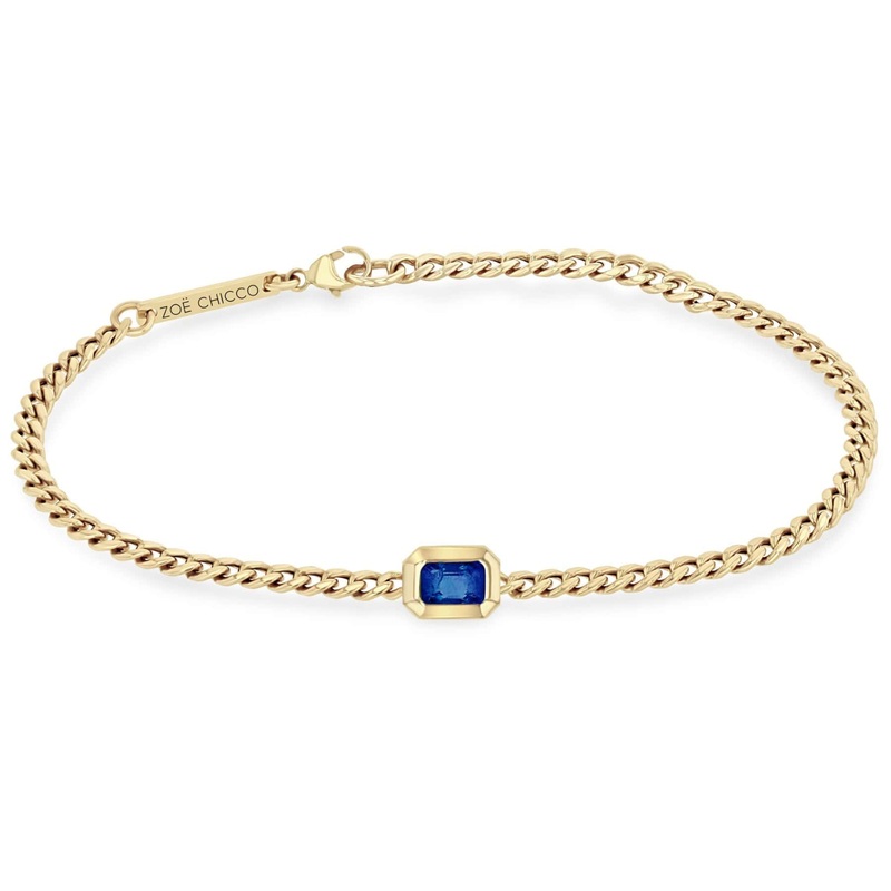 14k yellow gold small curb chain bracelet with a bezel set emerald cut blue sapphire stone.